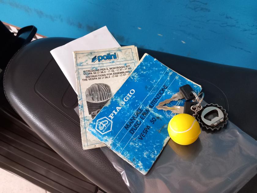 Accessori/note: PIAGGIO VESPA 50V. UNICOPROPRIETARIO. ESTETICA E CARROZZERIA COMPLETAMENTE ORIGINALE. STATO CONSERVATIVO OTTIMO. APPENA TAGLIANDATA CON INSTALLAZIONE DI NUOVI PNEUMATICI E BATTERIA NUOVA. AVVIAMENTO ELETTRICO, CAVALLETTO CENTRALE, PORTAPACCHI. FUNZIONAMENTO A MISCELA, CONDIZIONI PERFETTE ANCHE RELATIVE AL SERBATOIO. MODELLO A 3 MARCE CON SELETTORE A MANUBRIO.