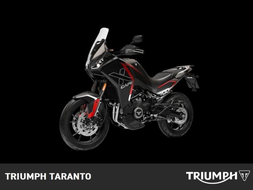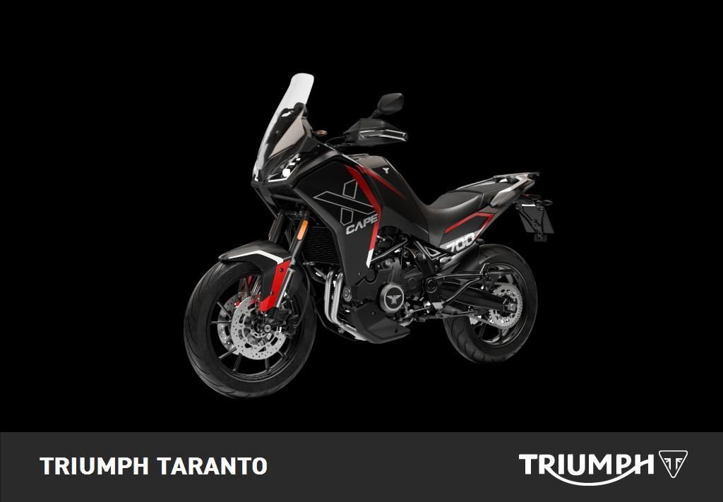 Comfort per ogni motociclista Progettata per gli amanti dell'avventura che cercano prestazioni e comfort, sportività e agilità, X-Cape 700 si caratterizza per una reattività eccellente, grazie al bicilindrico da 700cc capace di erogare 70 cavalli. Questo è il segreto della sua versatilità che la rende la compagna di viaggio ideale per esplorare scenari mozzafiato e godere appieno di una libertà senza limiti, tra rapide accelerazioni e sorpassi fluidi. Specifiche tecniche: Lunghezza x larghezza x altezza: 2200 x 900 x 1510 mm Interasse: 1490 mm Peso a secco: 213 kg Altezza Sella: 820mm / 845 mm Capacità serbatoio: 18 L Altezza da terra: 190 mm Tipo di motore: Bicilindrico in linea, 4 Tempi Cilindrata: 693 cc Alesaggio per corsa: 83 mm x 60 mm Compressione: 11.6:1 Coppia massima: 68 Nm / 6.9 kgm / 6500 rpm Massima potenza: 51.5 kW / 70 CV / 8500 rpm Sistema di iniezione: BOSCH Velocità massima: 170 Km/h Sistema di raffreddamento: Liquido Distribuzione: DOHC bicilindrico 8 valvole Emissioni: Euro 5+ Telaio: Acciaio Forcellone: Alluminio Anteriore: 110/80 19", cerchi a raggi o in lega (Pirelli Scorpion Rally STR per versione raggi)spoked rims) Posteriore: 50/70 17", cerchi a raggi o in lega (Pirelli Scorpion Rally STR per versione raggi) Freno anteriore: Doppi dischi da 298 mm, pinze flottanti, 2 pistoni Freno posteriore: Disco singolo da 255 mm, 2 pistoni ABS: BOSCH (disinseribile) Anteriori: forcella a steli rovesciati Marzocchi ø50mm, escursione ruota 175 mm, regolabile in precarico molla, controllo idraulico in estensione e compressione Posteriori: monoammortizzatore Kayaba, escursione ruota 165 mm, regolabile in precarico molla (remotato per versione cerchi a raggi), controllo idraulico in estensione. *NB: I costi relativi all'immatricolazione e all'eventuale spedizione sono da calcolarsi a parte. INFORMAZIONI AGGIUNTIVE: Avviamento Elettrico, Marmitta Catalitica