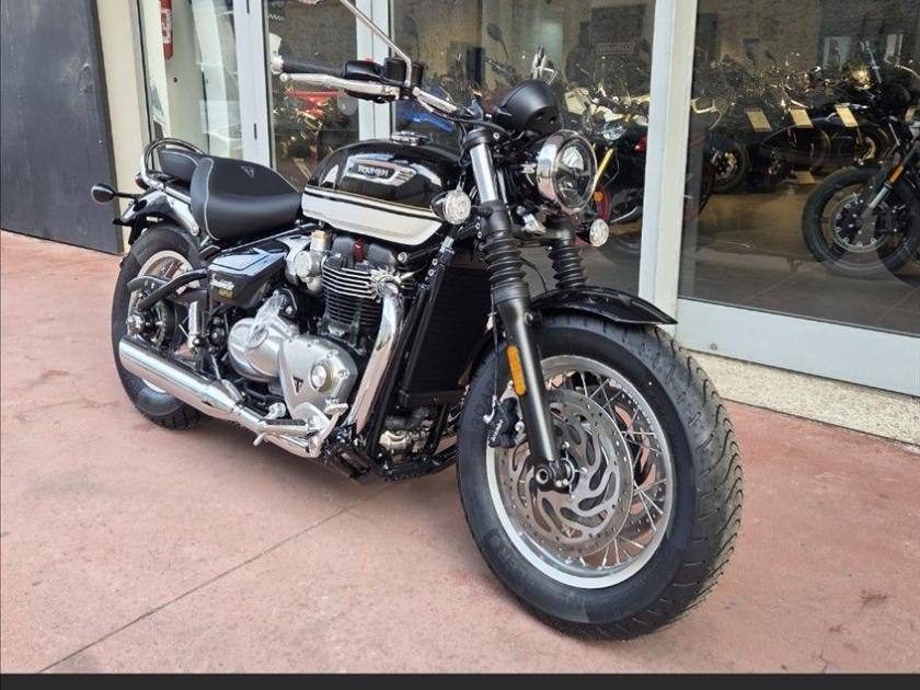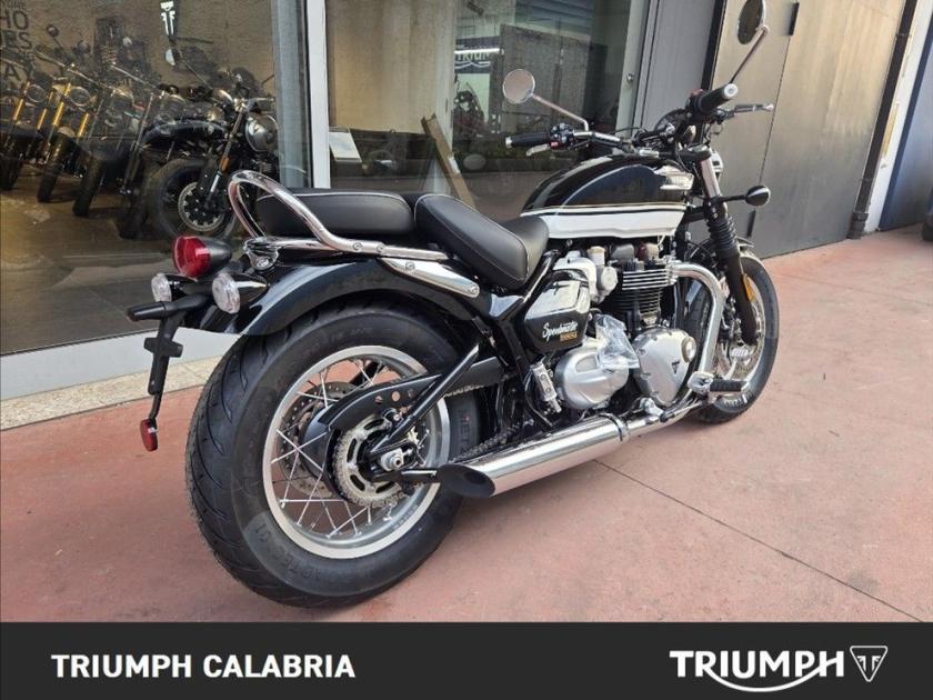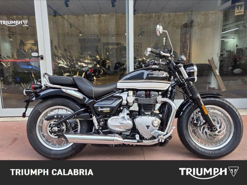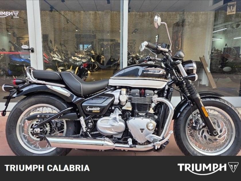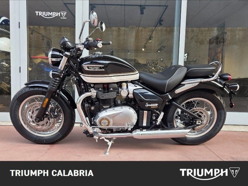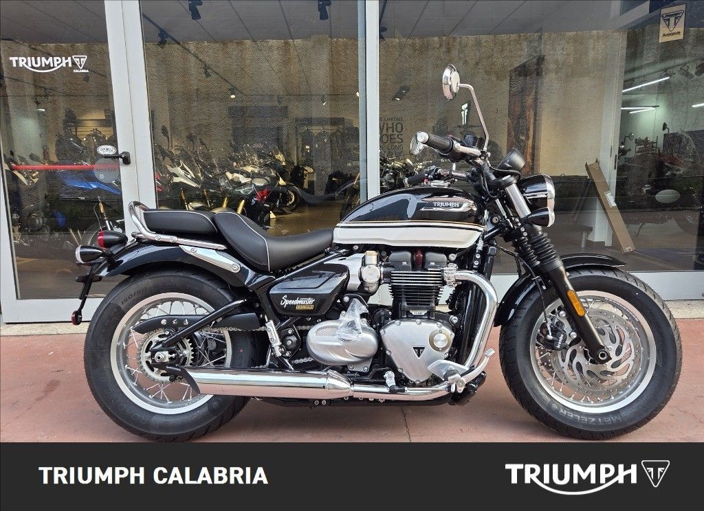 TRIUMPH SPEEDMASTER NUOVA IN PRONTA CONSEGNA COLORE SAPPHIRE BLACK / CRYSTAL WHITE FINANZIAMENTI A TASSO AGEVOLATO POSSIBILITÀ DI CONSEGNA IN TUTTA ITALIA SI VALUTANO PERMUTE Specifiche Tecniche Motore e Trasmissione Motore Bicilindrico parallelo raffreddato a liquido, 8 valvole, SOHC, manovellismo di 270° Cilindrata 1200 cc Alesaggio 97.6 mm Corsa 80 mm Rapporto di compressione 10:1 Potenza Massima (CE) 78 CV (57,5 kW) a 6.000 giri/min. Coppia Massima 106 Nm @ 3,750 rpm Sistema di iniezione elettronica con controllo elettronico dell'acceleratore Impianto di scarico 2-in-2 cromato con doppi silenziatori cromati Trasmissione finale Catena X-ring Frizione Multidisco in bagno d'olio, antisaltellamento, assistita Cambio 6 rapporti Telaio Telaio Tubolare in acciaio con traversini in acciaio Forcellone Doppia culla in acciaio Ruota Anteriore Allumino a raggi in acciaio, 32 raggi, 16 x 2,5 pollici Ruota Posteriore Allumino a raggi in acciaio, 32 raggi, 16 x 3,5 pollici Pneumatico Anteriore 130/90-16 Pneumatico Posteriore 150/80-16 Sospensione Anteriore Forcella Showa a cartuccia da 47 mm Sospensione Posteriore Ammortizzatore posteriore KYB (RSU) con leveraggio Freno Anteriore Doppio disco fisso da 310 mm, Brembo, pinze flottanti a 2 pistoncini, OCABS Freno Posteriore Disco singolo da 255 mm con pinza scorrevole Nissin a 1 pistoncino, OCABS Strumentazione e Funzioni Tachimetro analogico con display LCD multifunzione Dimensioni e Peso Larghezza Manubrio 910 mm Altezza Senza Specchietti 1055 mm Altezza Sella 705 mm Interasse 1500 mm Angolo di Inclinazione 25,3 ° Avancorsa 91 mm Peso in ordine di marcia 265 kg Capacità Serbatoio 14 l Consumo di carburante 4,4 l/100km Emissioni CO2 Euro 5+