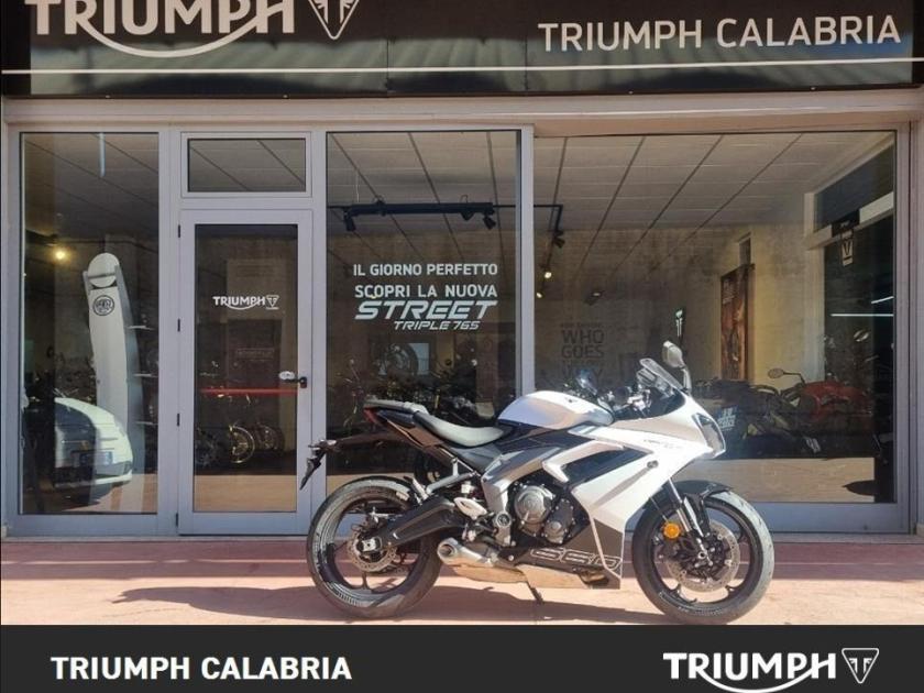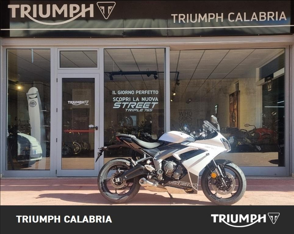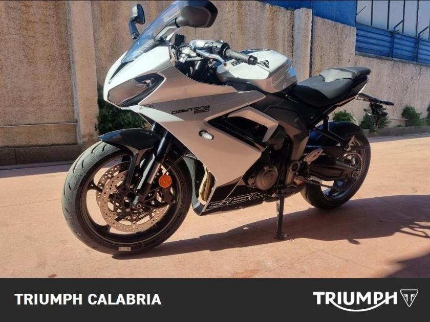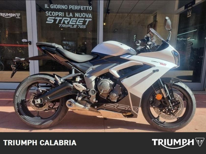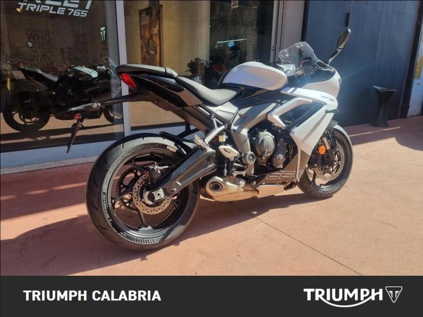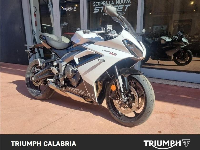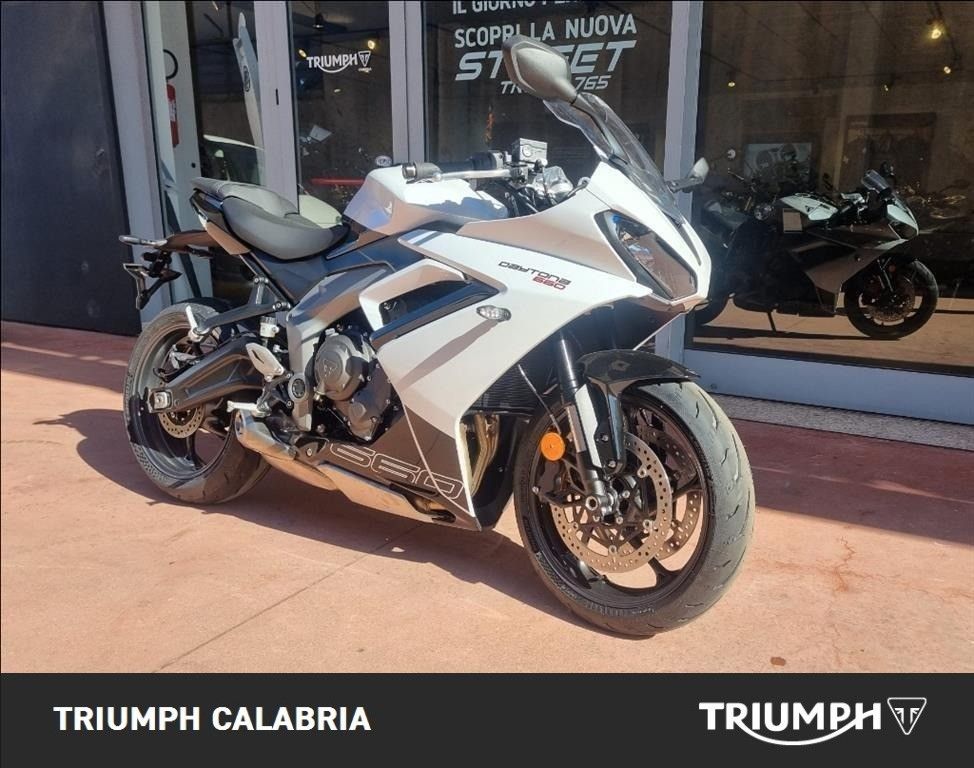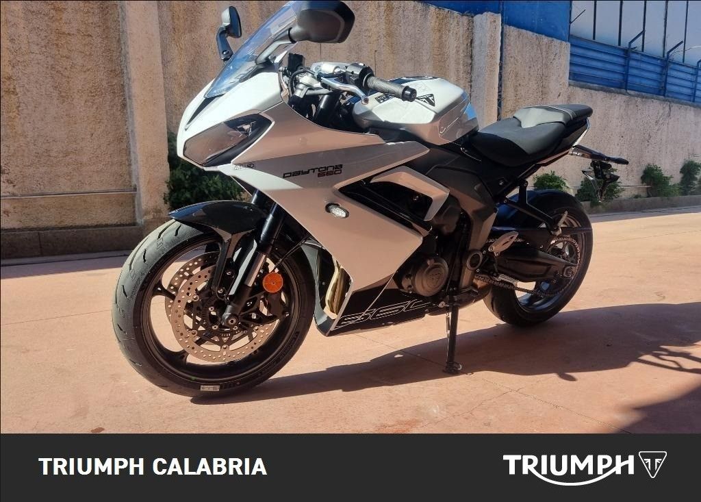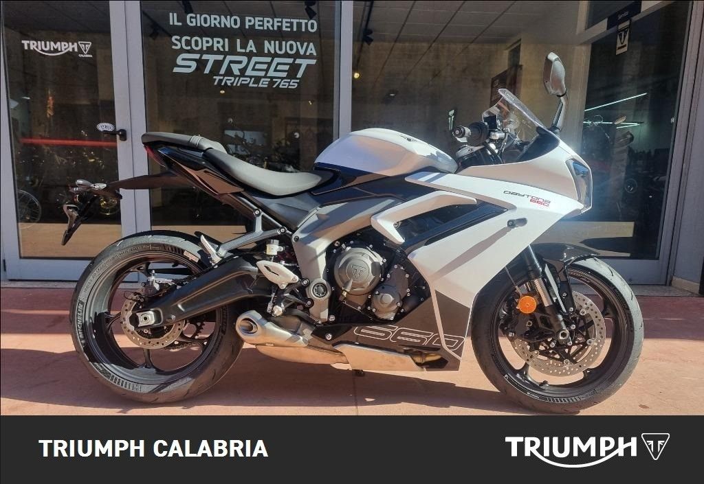 NUOVA DAYTONA 660 -Colore SNOWDONIA WHITE / SAPPHIRE BLACK -Nuova in pronta consegna -Consegna in tutta Italia -Garanzia Ufficiale Casa Madre valida 2 estendile a 3 o 4 anni -Finanziamenti a tassi agevolati MOTORE E TRASMISSIONE Motore Raffreddato a liquido, 12 valvole, doppio albero a camme in testa, 3 cilindri in linea Cilindrata 660 cc Alesaggio 74.04 mm Corsa 51.1 mm Rapporto di compressione 12.05 Potenza Massima (CE) 95 CV (70 kW) (95PS) a11,250 giri Coppia Massima 69 Nm @ 8,250 giri Sistema di iniezione Iniezione elettronica sequenziale multipoint con SAI con controllo elettronico dell'acceleratore Scarico Collettore di scarico in acciaio inossidabile 3 in 1 con silenziatore basso in acciaio inossidabile Trasmissione finale Catena X-ring Frizione Multidisco in bagno d'olio, antisaltellamento, assistita Cambio 6 rapporti TELAIO Telaio Telaio perimetrale in acciaio tubolare Forcellone Bibraccio, in acciaio Ruota Anteriore In lega di alluminio, 17 x 3,5" Ruota Posteriore In lega di alluminio, 17 x 5,5" Pneumatico Anteriore 120/70 ZR 17 Pneumatico Posteriore 180/55 ZR 17 Sospensione Anteriore Forcella a steli rovesciati Showa Big Piston con funzioni idrauliche separate (SF-BPF) da 41 mm, corsa ruota 110 mm Sospensione Posteriore Monoammortizzatore Showa con regolazione del precarico, corsa ruota 130 mm Freno Anteriore Doppio disco flottante da 310 mm, pinze radiali a 4 pistoncini, ABS Freno Posteriore Disco fisso da 220 mm, pinza scorrevole monopistoncino, ABS Strumentazione e Funzioni Strumentazione multifunzione con display TFT a colori DIMENSIONI E PESO Larghezza Manubrio 736 mm Altezza Senza Specchietti 1145.2 mm Altezza Sella 810 mm Interasse 1425.6 mm Angolo di Inclinazione 23.8 º Avancorsa 82.3 mm Capacità Serbatoio 14 L Peso in ordine di marcia 201 kg