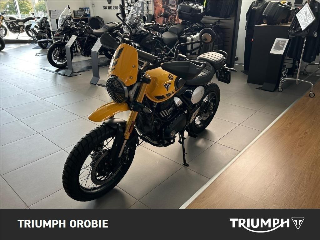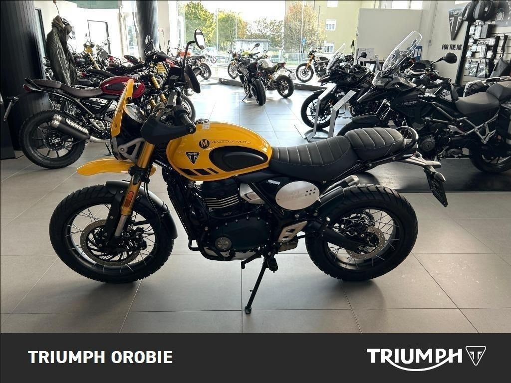 NUOVA SCRAMBLER 400 XC. Silhouette decisa e autentico DNA del design Triumph Scrambler. Ruote a raggi laterali pronte per l'avventura con cerchi anteriori da 19 pollici più grandi, pronte per l'esplorazione fuoristrada. Prezzo a partire da € 7.245,00. Monocilindrico raffreddato a liquido, 4 valvole, doppio albero a camme in testa, con cilindrata 398 e 40CV (29kW) a 8,000 giri/min. Iniezione elettronica Bosch con controllo elettronico dell'acceleratore. Tachimetro analogico singolo con display LCD multifunzione integrato, e traction control disinseribile. Forcella a steli rovesciati Big Piston da 43 mm Corsa ruota:150 mm. Monoammortizzatore posteriore a gas con serbatoio separato e regolazione del precarico Corsa ruota:150 mm. Disco fisso da 320 mm, pinza radiale a quattro pistoncini, ABS. Disco fisso da 230 mm, pinza flottante ByBreTM a singolo pistoncino, ABS. Fari a LED con luci diurne. Ulteriori informazioni: Garanzia ufficiale Triumph di 24 mesi, con possibilità di estensione a 48 mesi, a pagamento, entro il primo anno. Soccorso Stradale e Traino opera in caso di Guasto del motoveicolo per 24 mesi a partire dalla data di prima immatricolazione. Disponiamo di finanziamenti Promozionali Triumph, salvo approvazione della finanziaria. Valutiamo il ritiro del vostro usato. ATTENZIONE: è bene ricordare, benchè sia stata posta la massima cura per garantire la precisione e la correttezza dei contenuti di questa presentazione al momento della pubblicazione, essa non ha alcun valore in sede contrattuale. INFORMAZIONI AGGIUNTIVE: Avviamento Elettrico, Paramotore