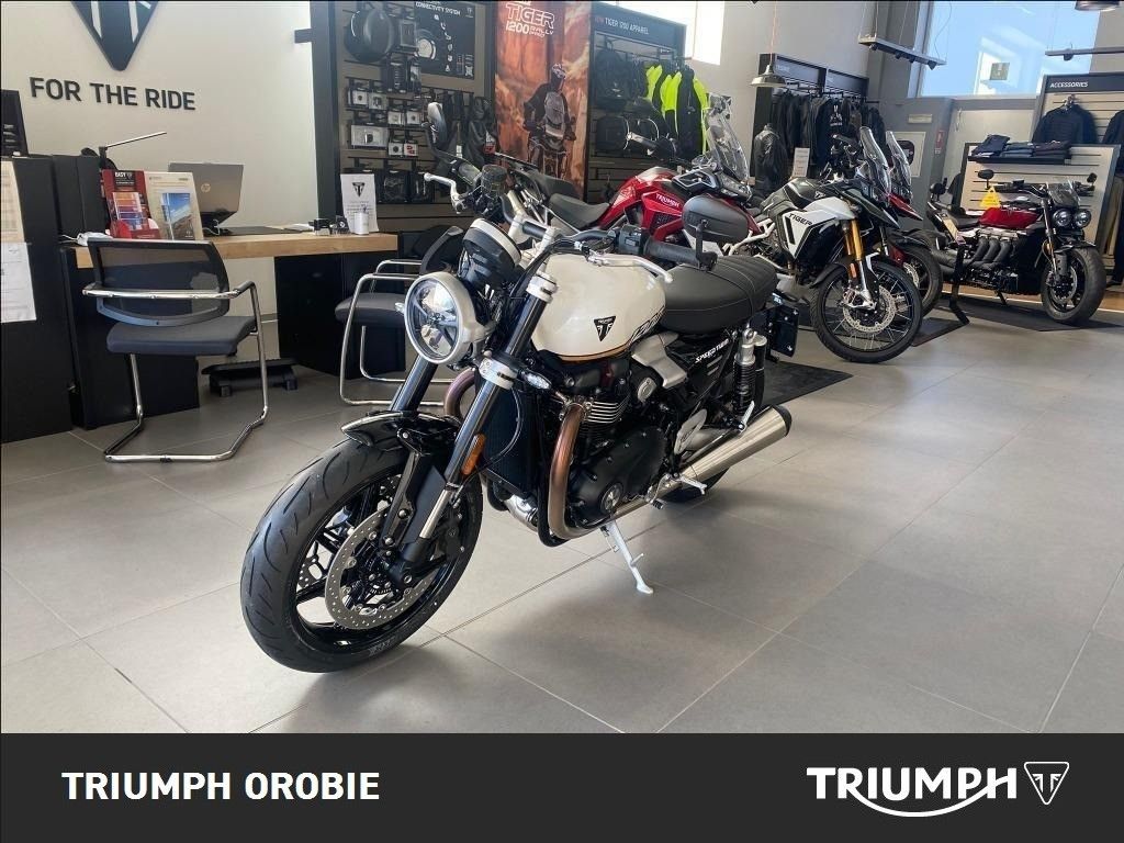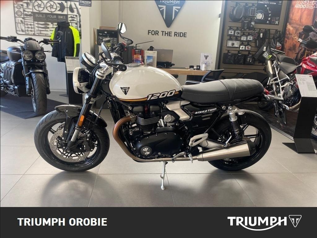 NUOVA SPEED TWIN 1200. La combinazione perfetta tra design moderno e DNA autentico, prestazioni sportive e handling dinamico in una moto dallo stile classico e dal carattere unico. Prezzo a partire da € 15.395,00 e l'applicazione di tutte le promo in essere sul modello. Bicilindrico parallelo raffreddato a liquido, 8 valvole con cilindrata 1200 e 105CV (77kW) a 7.750 giri/min. Iniezione elettronica multipoint con controllo elettronico dell'acceleratore. Due modalità di guida. Forcella a steli rovesciati Marzocchi da 43mm, escursione 120mm. Doppio ammortizzatore posteriore Marzocchi con serbatoi esterni, precarico regolabile, corsa ruota 116 mm. ABS e Traction Control cornering. Ulteriori informazioni: Garanzia ufficiale Triumph di 24 mesi, con possibilità di estensione a 48 mesi, a pagamento, entro il primo anno. Soccorso Stradale e Traino opera in caso di Guasto del motoveicolo per 24 mesi a partire dalla data di prima immatricolazione. Disponiamo di finanziamenti Promozionali Triumph, salvo approvazione della finanziaria. Valutiamo il ritiro del vostro usato. ATTENZIONE: è bene ricordare, benchè sia stata posta la massima cura per garantire la precisione e la correttezza dei contenuti di questa presentazione al momento della pubblicazione, essa non ha alcun valore in sede contrattuale. INFORMAZIONI AGGIUNTIVE: Avviamento Elettrico