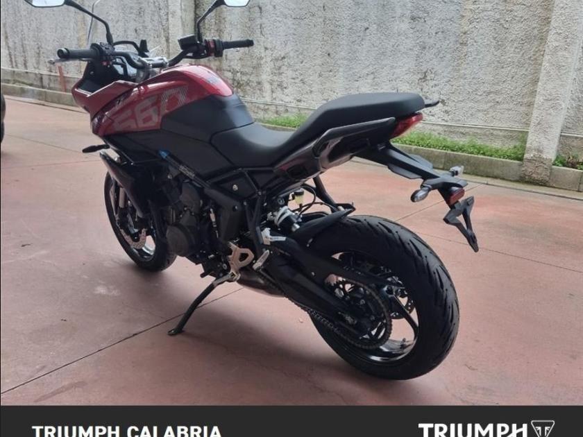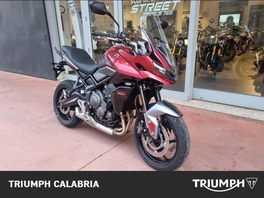 NUOVA TIGER SPORT 660 In pronta Consegna Carnival Red Possibilità di finanziamento e spedizione in tutta Italia *BORSE LATERALI IN OMAGGIO* Motore e Trasmissione Motore Raffreddato a liquido, 12 valvole, doppio albero a camme in testa, 3 cilindri in linea Cilindrata 660 cc Alesaggio 74.0 mm Corsa 51.1 mm Rapporto di compressione 11.95:1 Potenza Massima 81 CV (59.6 kW) @ 10,250 rpm Coppia Massima 64 Nm @ 6,250 rpm Sistema di iniezione elettronica sequenziale multipoint con SAI con controllo elettronico dell'acceleratore. 3 modalità di guida Impianto di scarico 3 in 1 in acciaio inossidabile Trasmissione finale Catena X-ring Frizione multidisco a bagno d'olio, assistita Cambio 6 rapporti Telaio Telaio perimetrale in acciaio tubolare Forcellone Bibraccio, in acciaio Cerchio Anteriore in alluminio a 5 raggi Tubeless 17 x 3,5" Cerchio Posteriore in alluminio a 5 raggi Tubeless 17 x 5,5" Pneumatico Anteriore 120/70 R 17 Pneumatico Posteriore 180/55 R 17 Sospensione Anteriore Showa 41mm Sospensione Posteriore Showa monoshock Freno Anteriore Doppio disco flottante da 310 mm, pinze radiali a 4 pistoncini, OCABS Cornering Freno Posteriore Disco singolo da 255 mm. Pinza scorrevole Brembo monopistoncino, OCABS Strumentazione multifunzione LCD con display TFT a colori integrato Dimensioni e Peso Larghezza Manubrio 834 mm Altezza Senza Specchietti 1398 mm / 1315 mm Altezza Sella 835 mm Interasse 1418 mm Angolo di Inclinazione 23.1 º Avancorsa 97 mm Capacità Serbatoio 17.2 L Peso in ordine di marcia 207 kg Consumo di carburante 4.7 litri / 100 km Emissioni CO2 107 g/km Normativa EURO 5 Intervallo di manutenzione a 16.000 KM o 12 mesi Dotazioni di serie Cruise control (NOVITÀ) Quickshifter (NOVITÀ) ABS ottimizzato per il controllo in curva (NOVITÀ) e controllo trazione Illuminazione full-LED con luluci di posizione (NOVITÀ) Parabrezza regolabile Modalità di guida: Sport (NOVITÀ), Road e Rain Strumentazione multifunzione con display TFT a colori Unità di connettività My Triumph (NOVITÀ)