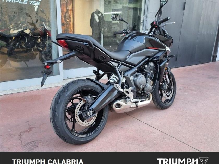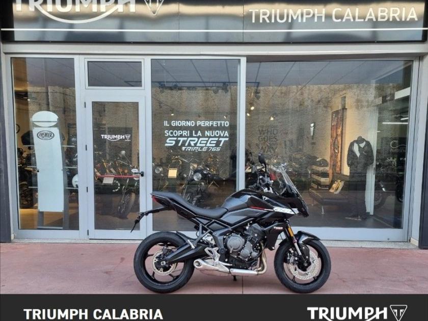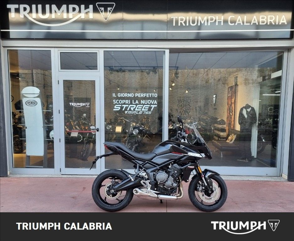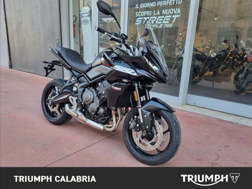 NUOVA TIGER SPORT 660 In pronta Consegna Sapphire Black Possibilità di finanziamento e spedizione in tutta Italia BORSE LATERALI IN OMAGGIO Specifiche Tecniche Motore e Trasmissione Motore Raffreddato a liquido, 12 valvole, doppio albero a camme in testa, 3 cilindri in linea Cilindrata 660 cc Alesaggio 74.0 mm Corsa 51.1 mm Rapporto di compressione 11.95:1 Potenza Massima (CE) 81 PS / 81 bhp (59.6 kW) @ 10,250 rpm Coppia Massima 64 Nm @ 6,250 rpm Sistema di iniezione elettronica sequenziale multipoint con SAI con controllo elettronico dell'acceleratore. 3 modalità di guida (Rain, Road e Sport) Scarico Impianto di scarico 3 in 1 in acciaio inossidabile con silenziatore laterale Trasmissione finale Catena X-ring Frizione multidisco a bagno d'olio, assistita Cambio 6 rapporti Telaio Telaio perimetrale in acciaio tubolare Forcellone Bibraccio, in acciaio Cerchio Anteriore in alluminio a 5 raggi Tubeless 17 x 3,5" Cerchio Posteriore in alluminio a 5 raggi Tubeless 17 x 5,5" Pneumatico Anteriore 120/70 R 17 Pneumatico Posteriore 180/55 R 17 Sospensione Anteriore Showa 41mm upside down separate function cartridge forks, 150mm wheel travel Sospensione Posteriore Showa monoshock RSU, with remote hydraulic preload adjustment, 150mm wheel travel Freno Anteriore a Doppio disco flottante da 310 mm, pinze radiali a 4 pistoncini, OCABS Cornering Freno Posteriore a Disco singolo da 255 mm. Pinza scorrevole Brembo monopistoncino, OCABS Strumentazione multifunzione LCD con display TFT a colori integrato Dimensioni e Peso Larghezza Manubrio 834 mm Altezza Senza Specchietti 1398 mm / 1315 mm (posizione parabrezza alto / basso) mm Altezza Sella 835 mm Interasse 1418 mm Angolo di Inclinazione 23.1 º Avancorsa 97 mm Capacità Serbatoio 17.2 L Peso in ordine di marcia 207 kg Consumo di carburante 4.7 litri / 100 km Emissioni CO2 107 g/km Normativa EURO 5 Intervallo di manutenzione a 16.000 KM o 12 mesi, a seconda della condizione che si verifica prima Dotazioni di serie Cruise control (NOVITÀ) Quickshifter (NOVITÀ) ABS ottimizzato per il controllo in curva (NOVITÀ) e controllo trazione Illuminazione full-LED con luci di posizione (NOVITÀ) Parabrezza regolabile Modalità di guida: Sport (NOVITÀ), Road e Rain Strumentazione multifunzione con display TFT a colori Unità di connettività My Triumph (NOVITÀ) Dotazioni optional Kit depotenziamento Manopole riscaldate Fari fendinebbia a LED Presa USB Presa di alimentazione ausiliaria Sistema di monitoraggio pressione pneumatici Triumph Track Plus e Find My Bike Tracker Accessori BORSE LATERALI IN OMAGGIO