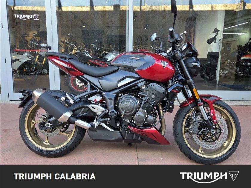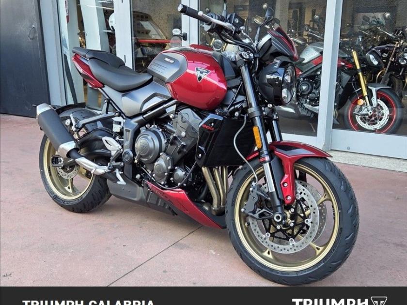 Triumph Trident 800 Colore Carnival Red In Pronta Consegna Possibilità di consegna in tutta Italia Finanziamenti a Tassi Agevolati Specifiche Tecniche Motore e Trasmissione Motore Raffreddato a liquido, 12 valvole, doppio albero a camme in testa, 3 cilindri in linea Cilindrata 798 cc Alesaggio 78 mm Corsa 55,7 mm Rapporto di compressione 13.2:1 Potenza Massima (CE) 115 CV (84,6 kW) a 10.750 giri/min. Coppia Massima 84 Nm @ 8,500 rpm Sistema di Iniezione elettronica sequenziale multipoint con SAI con controllo elettronico dell'acceleratore Impianto di scarico 3 in 1 in acciaio inox con silenziatore laterale in acciaio inox Trasmissione finale Catena X-ring Frizione Multidisco in bagno d'olio, antisaltellamento, assistita Cambio 6 rapporti Telaio Telaio perimetrale in acciaio tubolare Forcellone Acciaio saldato, a doppio lato Ruota Anteriore In lega di alluminio, 5 razze, 17 x 3,5" Ruota Posteriore In lega di alluminio, 5 razze, 17 x 5,5" Pneumatico Anteriore 120/70 R 17 Pneumatico Posteriore 180/55 R 17 Sospensione Anteriore Forcella rovesciata Showa BP-SFF da 41 mm, con regolazione di compressione e ritorno, escursione ruota 120 mm Sospensione Posteriore Ammortizzatore posteriore Showa RSU con regolazione del precarico e del ritorno, escursione ruota di 130 mm Freno Anteriore Doppio disco flottante da 310 mm, pinze radiali a 4 pistoncini, OCABS Freno Posteriore Disco fisso singolo da 220 mm, pinza flottante a singolo pistoncino, OCABS Strumentazione e Funzioni Strumentazione multifunzione LCD con display TFT a colori integrato Dimensioni e Peso Larghezza Manubrio 815 mm Altezza Senza Specchietti 1088 mm Altezza Sella 810 mm Interasse 1402 mm Angolo di Inclinazione 24,5 ° Avancorsa 108 mm Peso in ordine di marcia 198 kg Capacità Serbatoio 14 l Consumo di carburante 4,7 l/100km Co2 standard Euro 5+