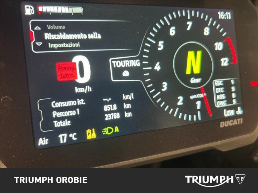 Scadenza Bollo : 02/2027 | Scadenza Revisione : 03/2027| Gomme : ant. 70% post. 70% | Permuta : Sì | Normativa antinquinamento : Euro 5. Accessori : Versione Rally con valigie laterali originali Ducati, estensore cavalletto laterale Givi, piastra per bauletto posteriore Givi. Ulteriori informazioni: 12 mesi di garanzia con possibilità di estensione a 24 mesi con assistenza stradale abbinando un finanziamento personalizzato. Valutiamo il ritiro del vostro usato. Moto in perfette condizioni. ATTENZIONE: è bene ricordare, benchè sia stata posta la massima cura per garantire la precisione e la correttezza dei contenuti di questa presentazione al momento della pubblicazione, essa non ha alcun valore in sede contrattuale. INFORMAZIONI AGGIUNTIVE: Avviamento Elettrico, Paramotore