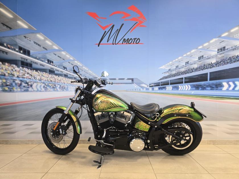 Harley Davidson Softail Blackline 1585 cc, design "Green Angel", composizione di questo ricercato disegno si ispira ai celebri disegni di Mucha e ad alle correnti artistiche Liberty che si diffondono in Europa all'inizio de XX secolo. Parliamo di una personalizzazione costata oltre 13.000 euro con l'aggiunta dello scarico, filtro aria e sella.