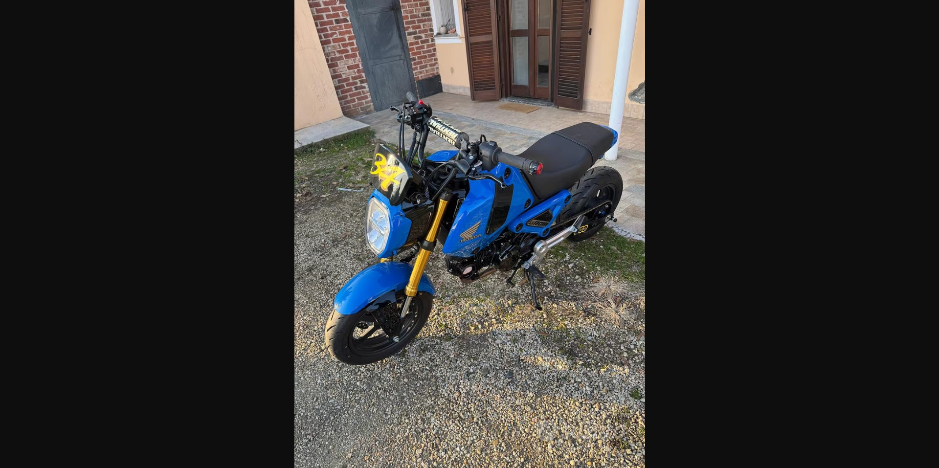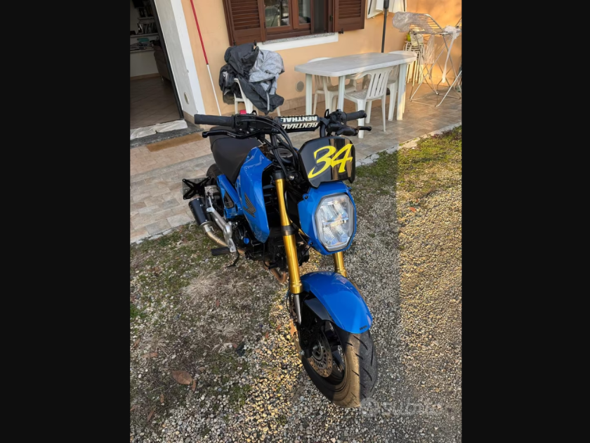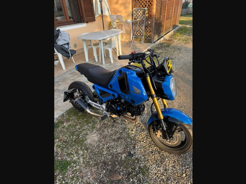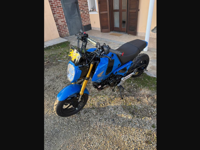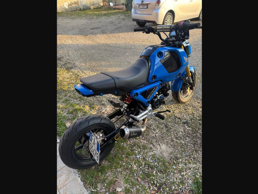 Honda grom 125 2022 con scarico Leovince completo, mono ammortizzatore yss faro posteriore con frecce integrate frecce anteriori piccole , porta numero leve freno frizione ricavate dal pieno, kit allungamento posteriore con catena pignone e corona fatti su misura, porta targa artigianale interamente in alluminio tantissimi particolari verniciati in carrozzeria di fiducia oblò del olio della testata in alluminio porta borse al manubrio perni in alluminio posteriore per il sollevamento ecc… la moto tenuta sempre in casa… tagliandata ogni 2000 km . Perfetta in ogni sua parte. La moto è da vetrina