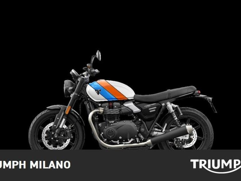 TRIUMPH SPEED TWIN 900, colore Pure White / Maui Blue / Tangerine Orange, Top di gamma delle modern classic entry level di casa Triumph. Moto DEMO con SOLI 400km. Pneumatici al 90%. Visionabile presso Triumph Milano in via Eugenio Brizi, 4. Per maggiori informazioni 02 9974 8923.