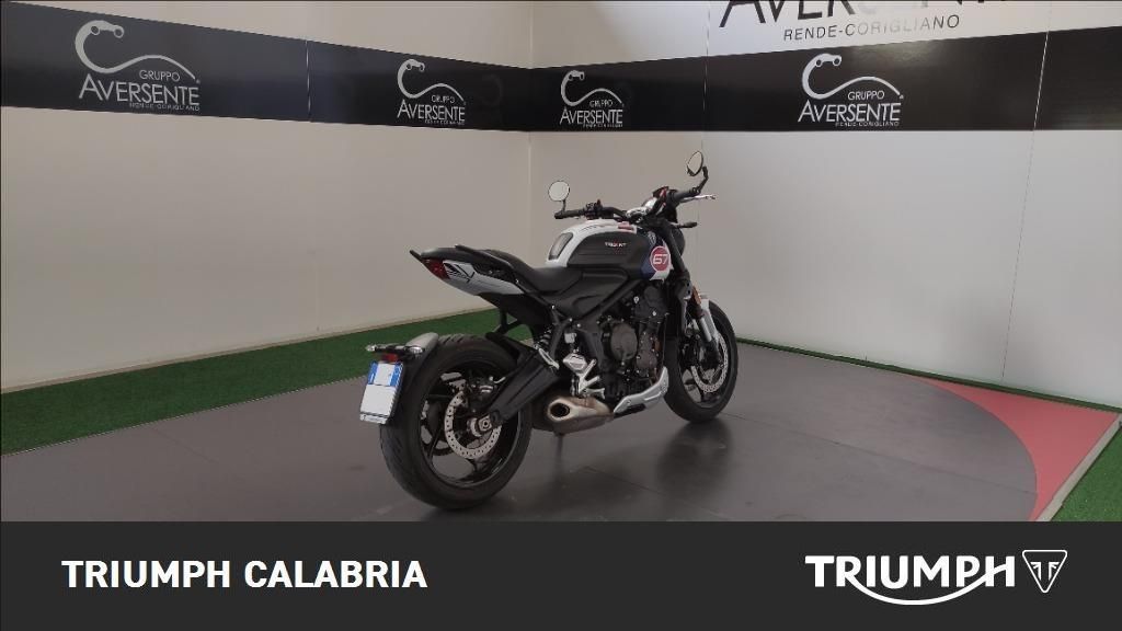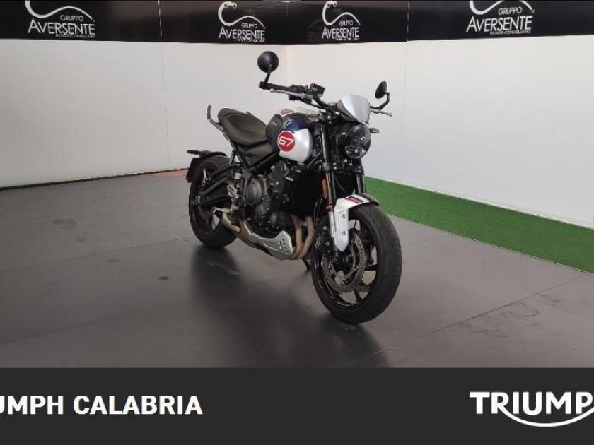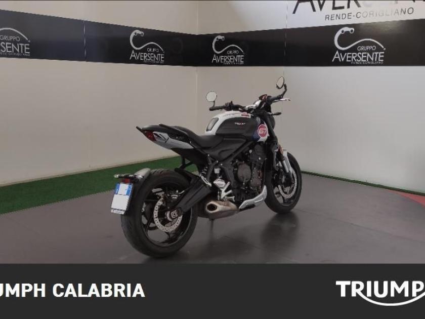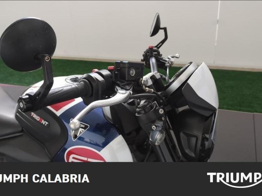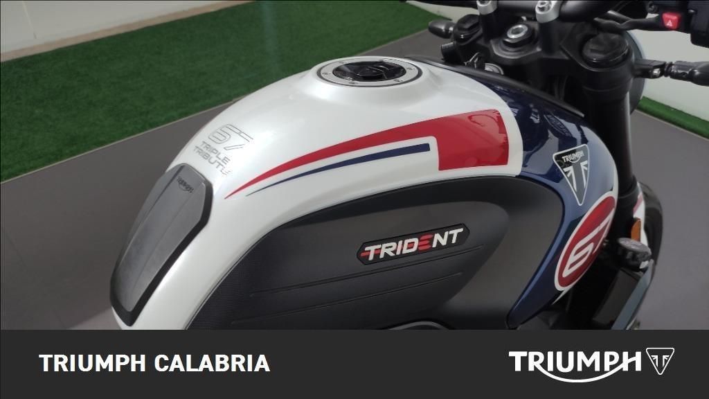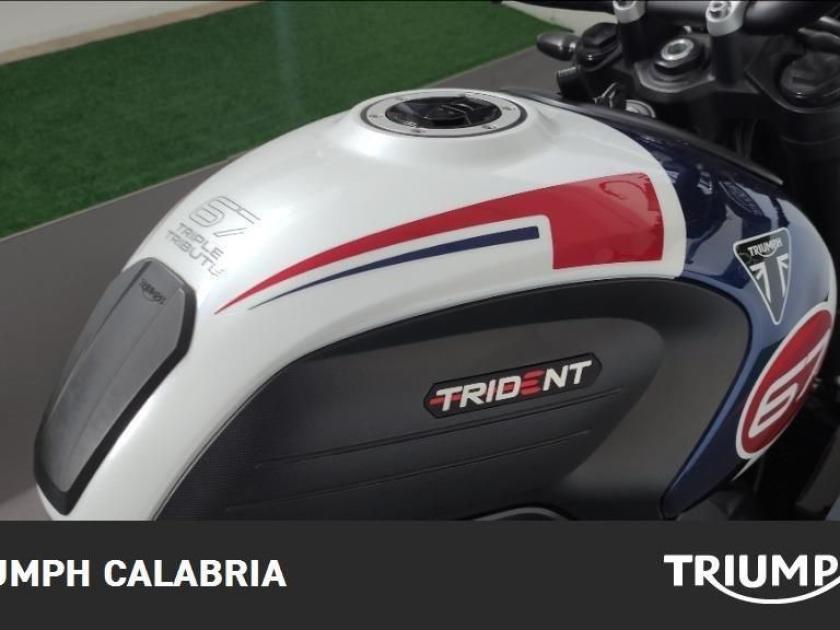 TRIUMPH TRIDENT TRIBUTE EDITION 11/2024 KM 16.200 Possibilità di finanziamento e Consegna in tutta Italia OPTIONAL SPECCHIETTI MANIGLIONI PARASERBATORIO MOTORE E TRASMISSIONE Motore Raffreddato a liquido, 12 valvole, doppio albero a camme in testa, 3 cilindri in linea Cilindrata 660 cc Alesaggio 74,0 mm Corsa 51,1 mm Rapporto di compressione 11,95:1 Potenza Massima (CE) 81 CV (60 kW) a 10.250 giri Coppia Massima 64 Nm a 6.250 giri Sistema di Iniezione elettronica sequenziale multipoint con SAI con controllo elettronico dell'acceleratore Scarico Collettore di scarico in acciaio inossidabile 3 in 1 con silenziatore basso in acciaio inossidabile Trasmissione finale Catena X-ring Frizione Multidisco in bagno d'olio, antisaltellamento, assistita Cambio 6 rapporti TELAIO Telaio perimetrale in acciaio tubolare Forcellone Bibraccio in acciaio Ruota Anteriore In lega di alluminio, 17 x 3,5" Ruota Posteriore In lega di alluminio, 17 x 5,5" Pneumatico Anteriore 120/70R17 Pneumatico Posteriore 180/55R17 Sospensione Anteriore Forcella Showa da 41 mm, a steli rovesciati, con funzioni separate (SFF) Sospensione Posteriore Monoammortizzatore Showa, con regolazione del precarico Freno Anteriore Doppio disco da 310 mm con pinze scorrevoli Nissin a 2 pistoncini, ABS Freno Posteriore Monodisco da 255 mm, pinza scorrevole Nissin monopistoncino, ABS Strumentazione e Funzioni Strumentazione multifunzione con display TFT a colori DIMENSIONI E PESO Larghezza Manubrio 795 mm Altezza Senza Specchietti 1089 mm Altezza Sella 805 mm Interasse 1401 mm Angolo di Inclinazione 24,6 º Avancorsa 107,3 mm Capacità Serbatoio 14 L Peso in ordine di marcia 189 kg Consumo Carburante ** 4.5 l/100km) Intervallo di manutenzione 16.000 KM o 12 mesi, a seconda della condizione che si verifica prima.